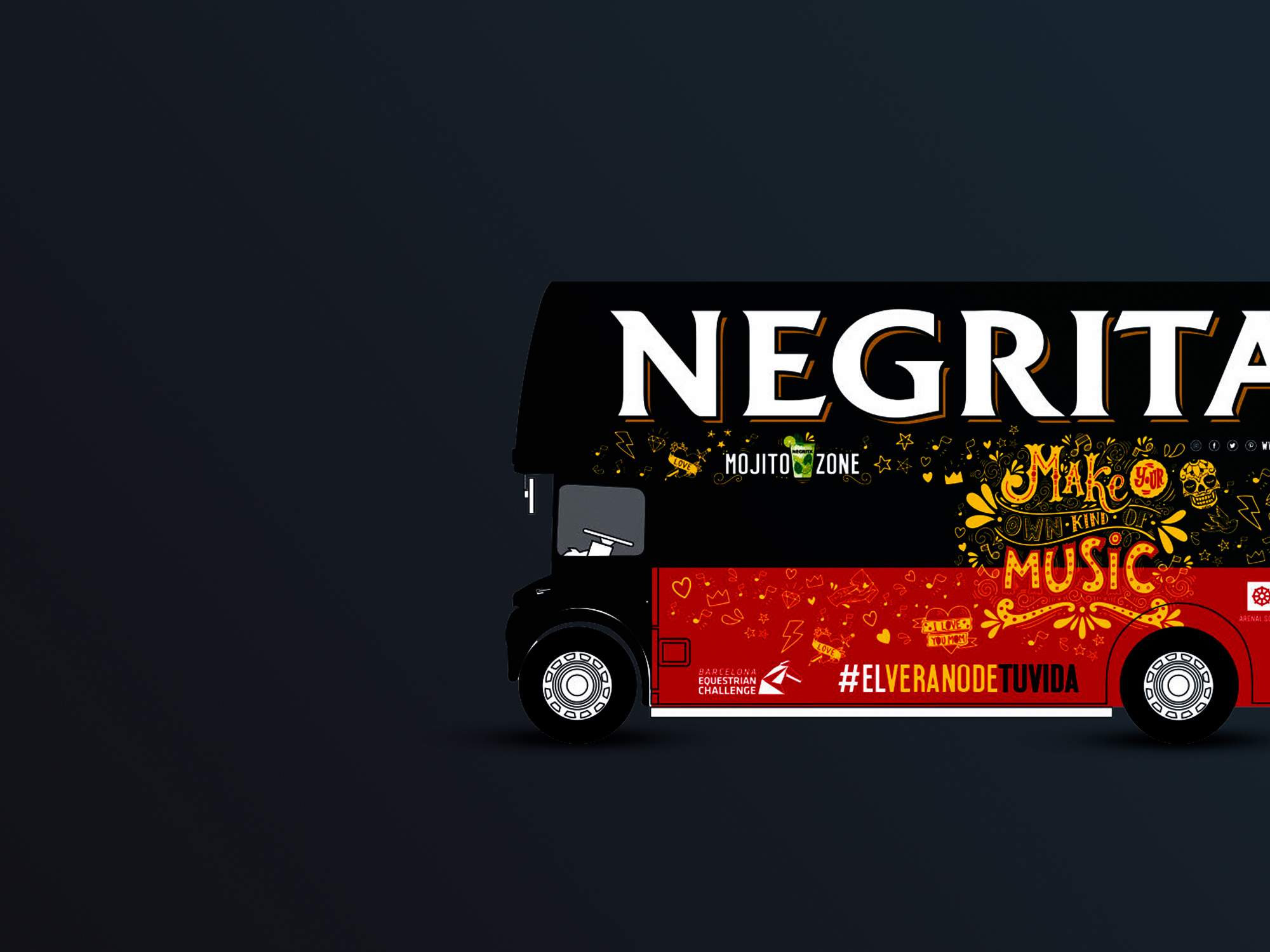 Briefing. La marca de Grup Bardinet Ron Negrita nos solicita diseñar los autobuses promocionales que van destinados a los festivales más importantes del país.