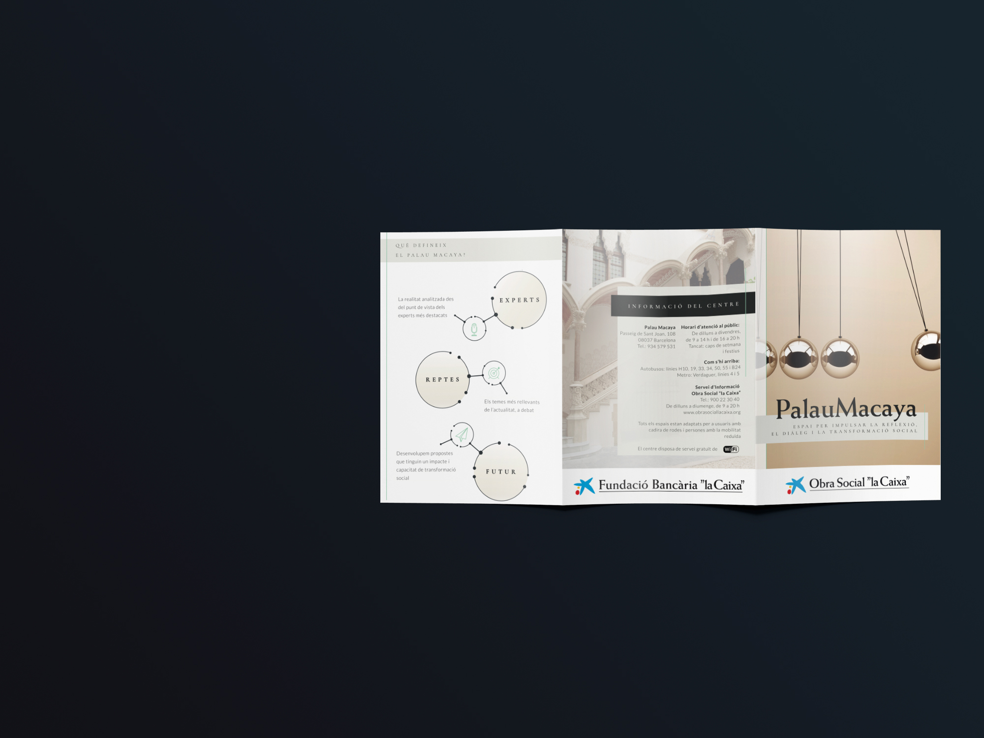 Briefing. El Palau Macaya es un centro de ”la Caixa” destinado al impulso de la reflexión y el debate sobre los temas más relevantes de la actualidad. Tras unos años desde su creación, surgió la necesidad de definir de forma clara su identidad de marca y los valores sobre los cuales se desarrolla su actividad.