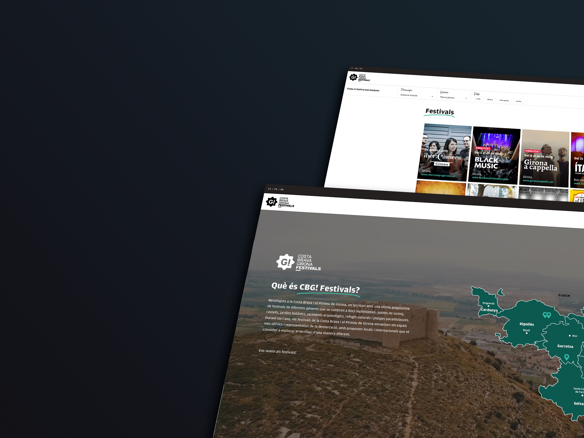Briefing. El Patronat de Turisme Costa Brava Girona fomenta la creación de herramientas destinadas a facilitar a los agentes que intervienen en la mediación turística la programación de los paquetes y la confección de ofertas. Siguiendo esta línea, solicitaban crear un espacio digital ordenado y fácil de navegar donde encontrar todos los festivales de la Costa Brava y el Pirineu de Girona y, a la vez, incentivar la cultura y los festivales, tan afectados por la Covid-19.