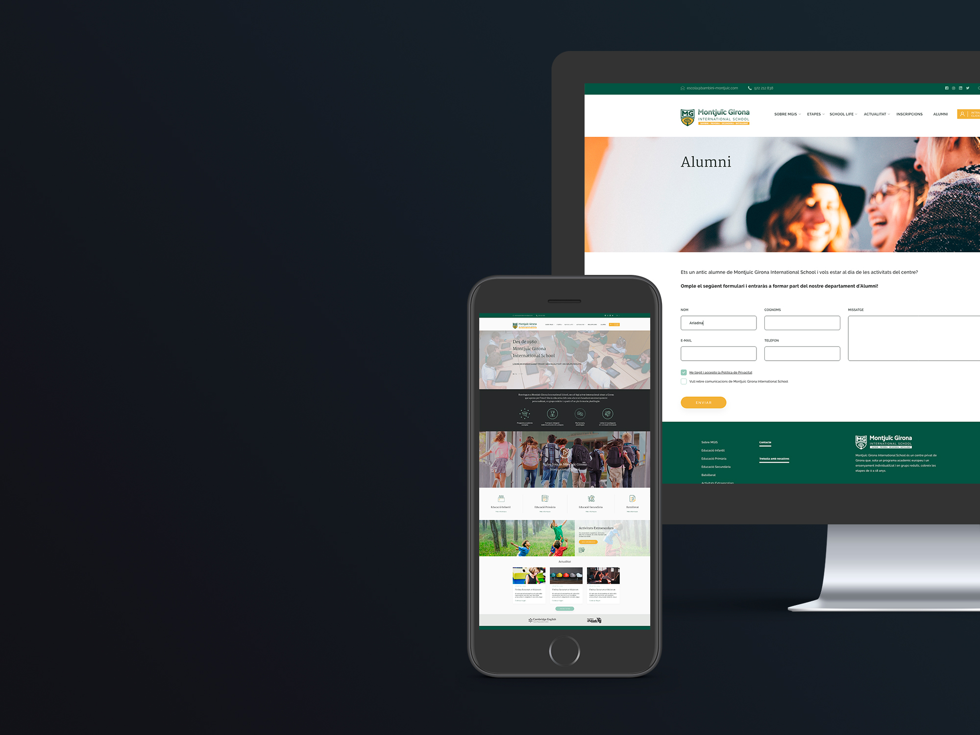 Briefing. Montjuïc Girona International School (MGIS) es un colegio privado internacional situado en Girona que imparte formación integral en cuatro etapas (Infantil, Primaria, Secundaria y Bachillerato), en el marco de una enseñanza individualizada y en grupos reducidos. Todo ello de acuerdo con un programa educativo europeo y plurilingüe. El objetivo del proyecto es tener una herramienta de comunicación digital más visual, que potencie los servicios que ofrece el centro, al mismo tiempo que capta leads que puedan acabar convirtiéndose en nuevos alumnos.